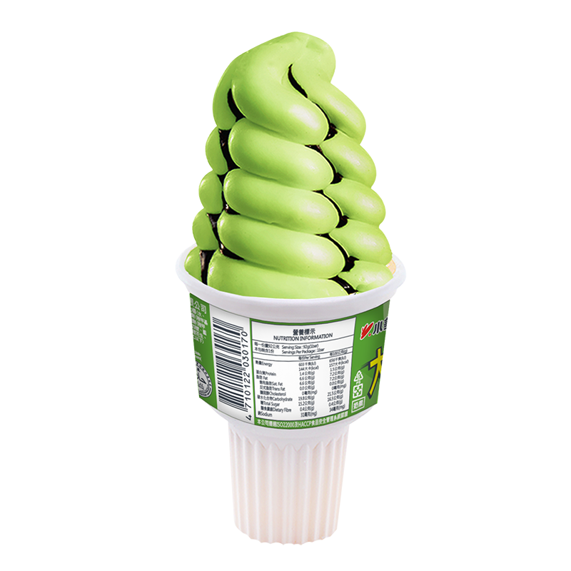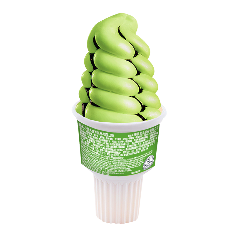 Ingredients: Water, Sugar, Coconut Oil, Maltose, Wafer Cone (Flour, Cornstarch, Frying Oil, Lecithin), Skim Milk Powder, Whey Powder, Chocolate Sauce (Water, Sugar, Cocoa Powder, Maltose, Palm Kernel Oil, Soybean Oil, Cocoa Mass, Soy Lecithin, Emulsifiers (Sucrose Stearate), Thickeners (Sodium Carboxymethyl Cellulose), Vanillin), Matcha Powder, Cornstarch, Thickeners (Locust Bean Gum, Carrageenan, Guar Gum, Sodium Carboxymethyl Cellulose, Xanthan Gum, Sodium Alginate), Emulsifiers (Mono and di-glycerides of fatty acids (E471), Polysorbate 80), Flavors (Milk, Matcha), Salt, FD&C Yellow#5 (E102), FD&C Blue #1(E133)