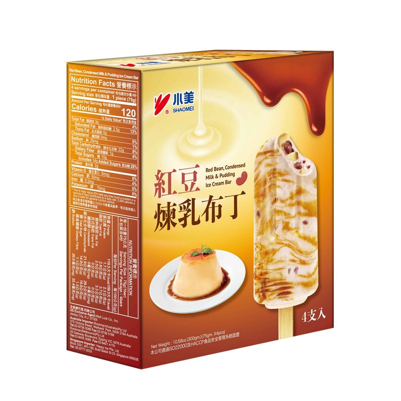 Ingredients: Water, Red Bean Paste Brix Add (Water, Red Bean, Maltose, Sugar, Salt), Pudding Jelly (Water, Sugar, Maltose, Skim Milk Powder, Egg, Maltodextrin, Thickeners (Locust Bean Gum, Carrageenan, Guar Gum, Xanthan Gum), Flavors, Food Coloring (FD&C Yellow#5 (E102&E110)), Sugar, Maltose, Coconut Oil, Skim Milk Powder, Condensed Milk (Sugar, Milk Powder Water, Maltose, Coconut Oil, Butter, Emulsifiers (Mono and di-glycerides of fatty acids, Sodium Stearyl 2- Lactylate), Lactose), Whey Powder, Maltodextrin, Thickeners (Sodium Carboxymethyl Cellulose, Locust Bean Gum, Carrageenan, Guar Gum, Xanthan Gum, Sodium Alginate),Flavors, Food Coloring (Caramel (E150a )), Cornstarch, Emulsifiers (Mono and di-glycerides of fatty acids (E471), Polysorbate 80), Salt